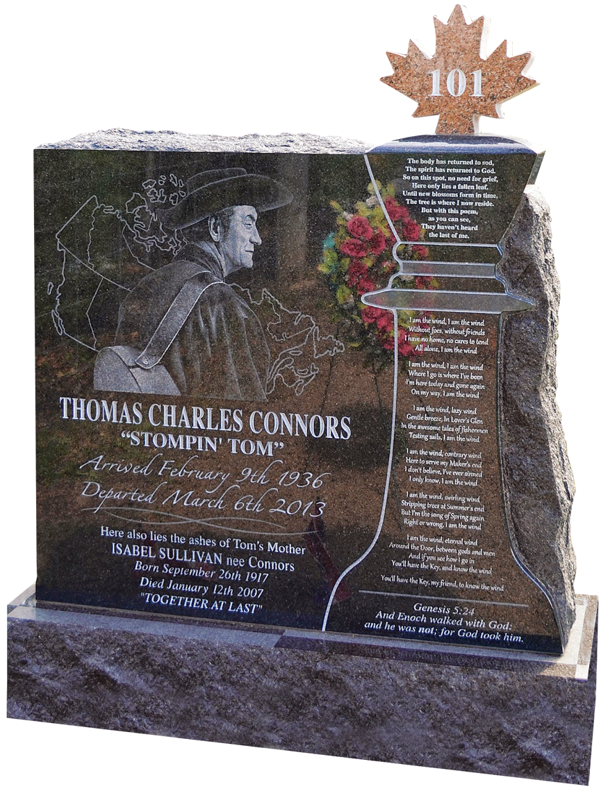 So after the Celebration of life event had passed, I was then asked by Tom Jr. and Lena if I would consider designing the Grave / Tombstone that would be placed upon Tom’s final resting place. Again, another honour to actually be asked to do such a project for Tom and his family. I worked with the Connors in what Tom had invisioned to have on his stone and I have to say it turned out GREAT.